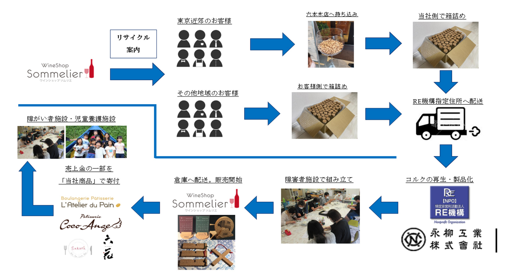コルク回収・送付→洗浄・再生→再製品化→寄付による循環